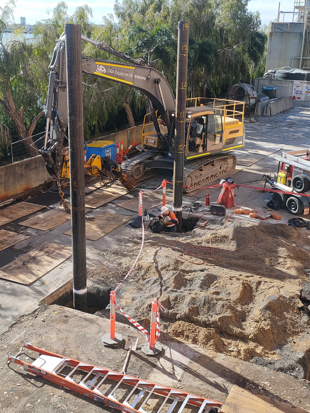 Our in-house design and fabrication capabilities allowed us to produce large-diameter screw piles tailored to site demands. Custom fabrication, hydraulic grabs, and off siding support ensured efficient installation with minimal movement in the tight workspace.